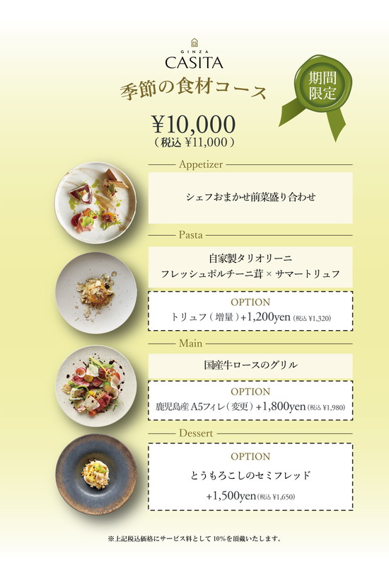 銀座カシータでは 6月1日(日) ~ 6月30日(月) の期間限定でディナータイムにて、 季節の食材を使用したスペシャルメニューをご用意致します。