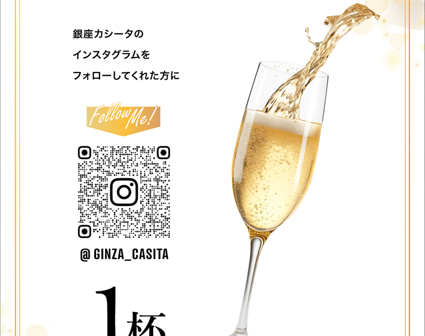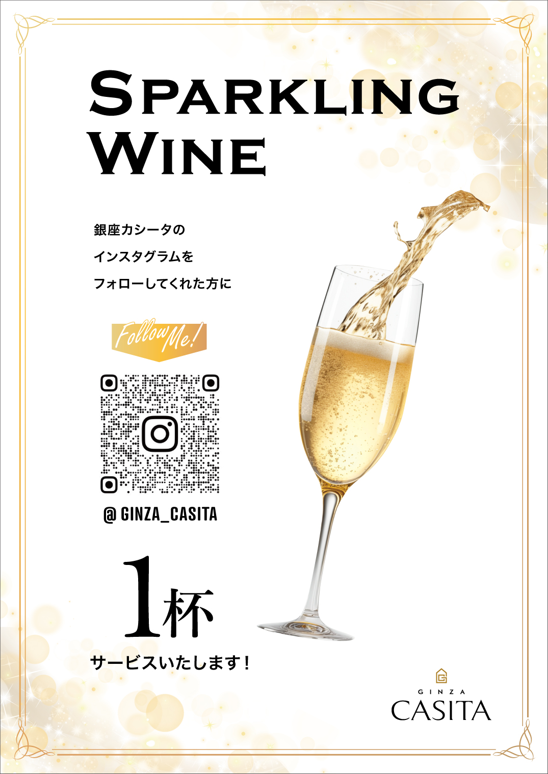 ただいまインスタグラムのキャンペーンを実施中です! 銀座カシータのインスタグラムをフォローしていただくと スパークリングワインを1杯サービスさせていただきます