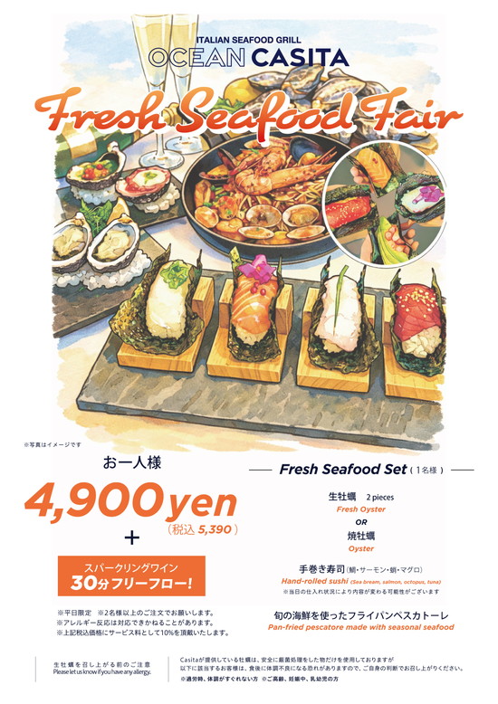オーシャンカシータの新しいプラン! フレッシュシーフードプランが1月15日より開始いたします! * * 生牡蠣2ピース OR 焼牡蠣 * * 手巻き寿司4巻 * * フライパンペスカトーレ * * スパークリングワイン30分飲み放題! * *